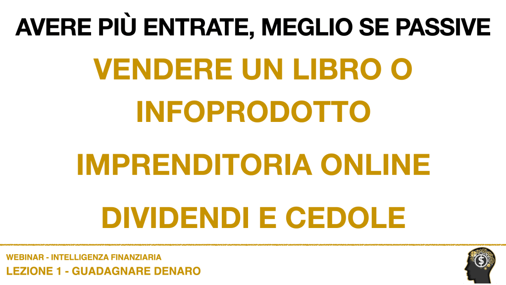 Quella che vedi qui sotto è una delle slide del webinar che faccio per sviluppare Intelligenza Finanziaria dove metto in risalto alcuni tipi di entrate che oggi possiamo ricevere sfruttando il web!