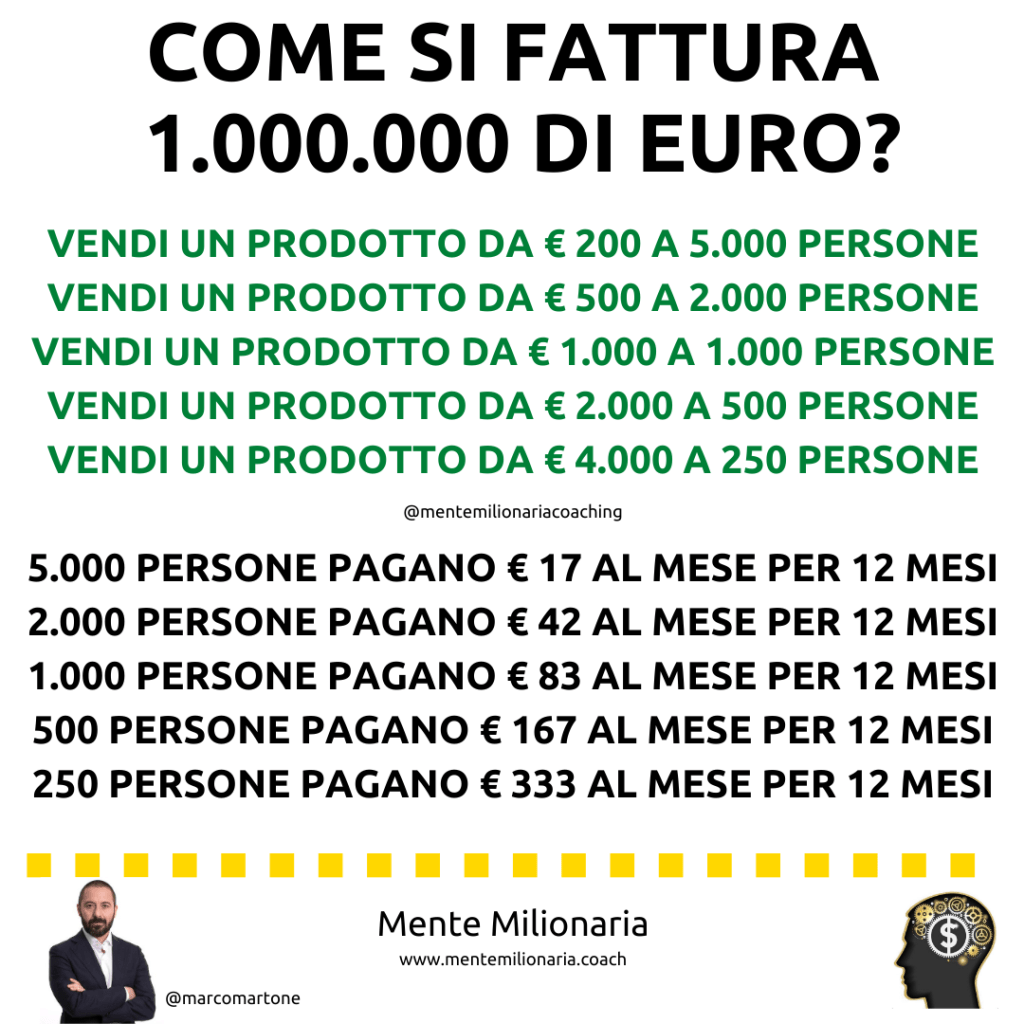 È palese che più è alto il prezzo del prodotto o del servizio e meno vendite dobbiamo effettuare per raggiungere l’obiettivo di fatture un milione di Euro! Più è alta la nostra reputazione e più possiamo chiedere! Ora, senza entrare nel merito del tempo, perché l’obiettivo può essere realizzato in 6 mesi come 3 anni, ciò che è importante è che sia possibile! E lo è se si riesce ad arrivare ad un certo numero di persone! Il grandissimo vantaggio dell’imprenditoria online è proprio questo, il mercato potenziale a cui puoi arrivare con i tuoi prodotti e servizi è enorme!