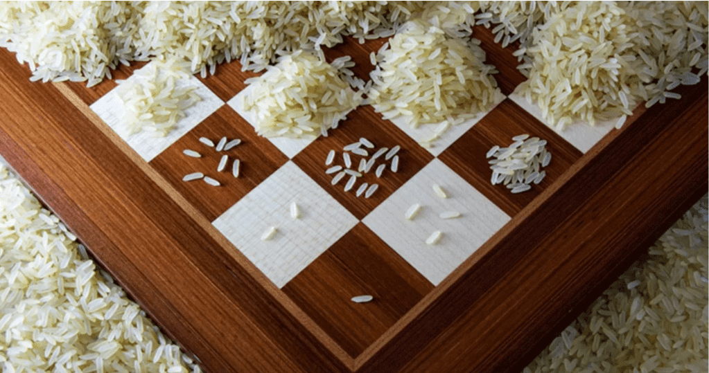 Un chicco di riso che raddoppia 64 volte di fila (i quadrati di una scacchiera) genera 9.223.372.036.854.780.000 chicchi di riso.