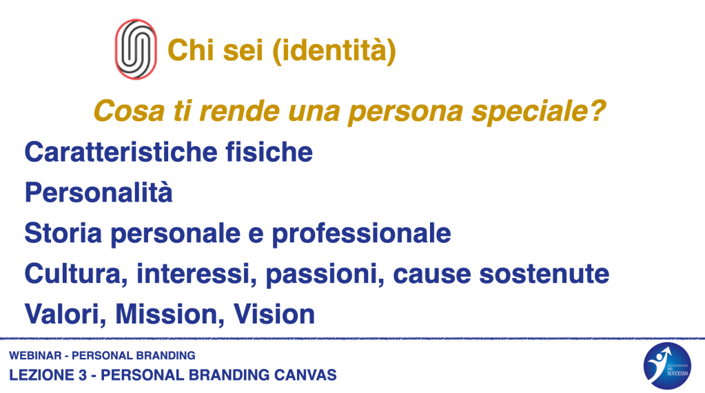 Il webinar sul PERSONAL BRANDING è la versione online proprio del corso di PERSONAL BRANDING di cui sono Trainer in aula presso l’Accademia del Successo, che si occupa dell’apprendimento delle competenze necessarie al successo personale e professionale!