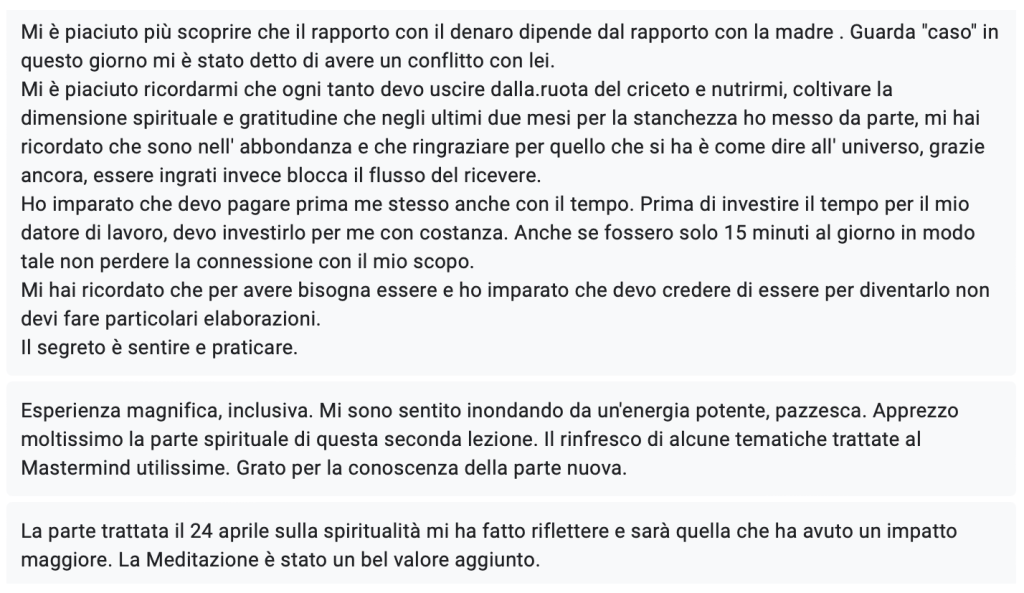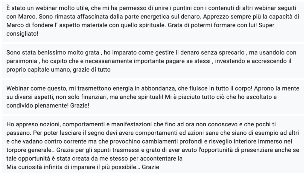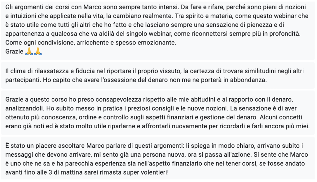 Il numero LIMITATO di partecipanti permetterà interazione tra noi e la possibilità, per chi vuole, di farmi domande! Ho previsto una prima ora e mezza di trasmissione di contenuti, anche col supporto di slide che poi renderò scaricabili dopo ogni singolo appuntamento, e una mezz’ora di interazione per rispondere a domande, dubbi e curiosità!