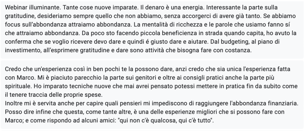 Due appuntamenti LIVE da 135 minuti l’uno, LIVE sulla piattaforma Google Meet, e non video registrati! Ogni appuntamento ha lo scopo di disintossicare la tua mente e le tue abitudini finanziarie, intossicate dal Sistema che ti vuole povero ed indebitato, affinché tu possa prendere il controllo e rimettere in forma le tue finanze.